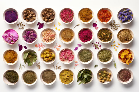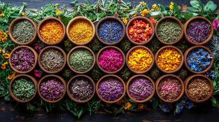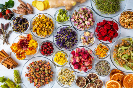 Assortment of dry herbal tea concept. Medicinal herbs healing herbs and alternative medicine.