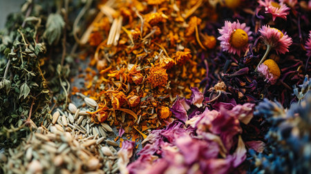 A vibrant herbal tea blend featuring dried flowers and spices, creating soothing and aromatic experience