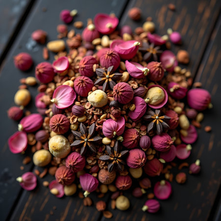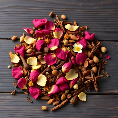A delicate mix of dried spices and flowers, arranged artistically on a dark wooden surface.