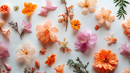 An overhead view displays a collection of assorted flowers. The composition features various shades of pink, orange, and white blossoms against a bright backdrop. The arrangement highlights delicate petals and natural textures. This image may be suitable for decorative designs, editorial content, or commercial projects.