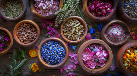 A variety of dried herbs and flowers arranged in wooden bowls on a rustic surface, perfect for illustrating herbal medicine, cooking, or natural beauty products.