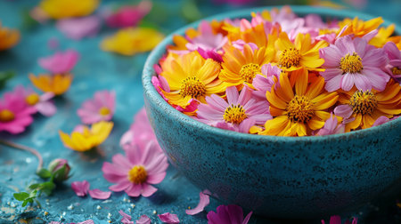 A collection of colorful, vibrant flowers arranged in a blue ceramic bowl, creating a fresh and cheerful aesthetic.