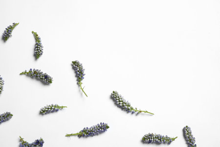 Beautiful floral composition with flowers on white background, flat lay. Space for text