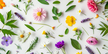A collection of various wildflowers in shades of pink, purple, orange, and blue are scattered on a plain white background. The flowers include daisies, anemones, and other delicate blooms, each with their distinct shapes and colors. The arrangement is natural and organic, with the stems and leaves adding to the overall aesthetic.