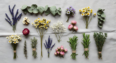 A flat lay composition of various fresh and dried herbs and flowers on a grey linen background. The arrangement includes lavender, chamomile, rosemary, thyme, eucalyptus, and dried roses, tied in small bunches, representing aromatherapy, natural remedies, and wellness.