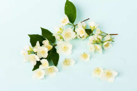 Beautifull white jasmine flowers isolated on blue background, close up