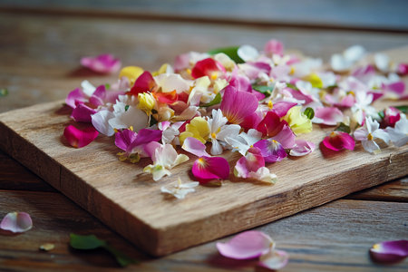 Delicate flower petals in vibrant hues rest upon a weathered wooden board, celebrating nature's artistry. A gentle touch of spring and freshness captures the rustic charm of the setting.