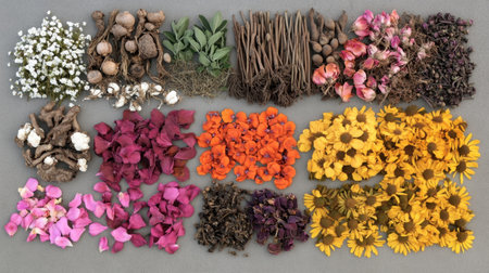 Close-up view of various dried plant materials showcasing unique textures and colors, perfect for culinary, crafts, or wellness uses, evoking nature's beauty.