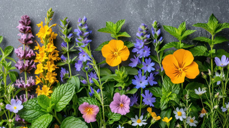 An appealing display of assorted dried herbs and flowers artfully arranged on a slate surface, perfect for culinary, decorative, or wellness purposes, showcasing vibrant colors and textures.