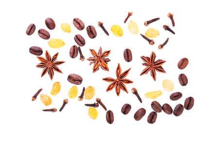 Anise star with cloves, raisins and coffee beans on white background top view