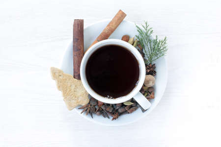 Black tea in a white mug placed on a table decorated with spices and a top view / Festive table setting of tea