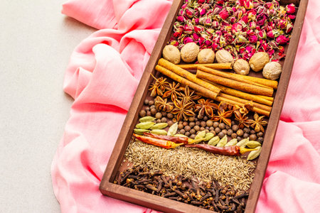 Ras el Hanout, exotic luxury spice with rose petals. Ingredients for preparation oriental spice mix in wooden box. An essential spice for any Moroccan dishes. Stone background, pink cloth copy space