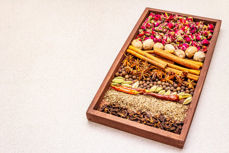 Ras el Hanout, exotic luxury spice with rose petals. Ingredients for preparation oriental spice mix in wooden box. An essential spice for any Moroccan dishes. Stone background copy space top view