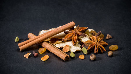 Aromatic spices on a dark background. Selective focus.