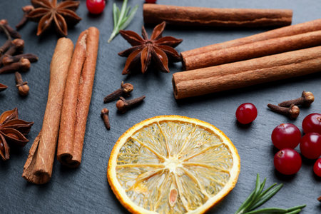Different spices, fresh rosemary, cranberries and dry orange slice for mulled wine on black table, closeup