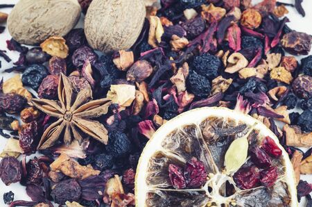 colorful kinds of fruits, flowers and herbs for tea