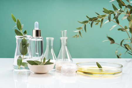 Natural skin care beauty products, Natural organic botany extraction and scientific laboratory glassware, Blank label cosmetic container for branding mock-up.
