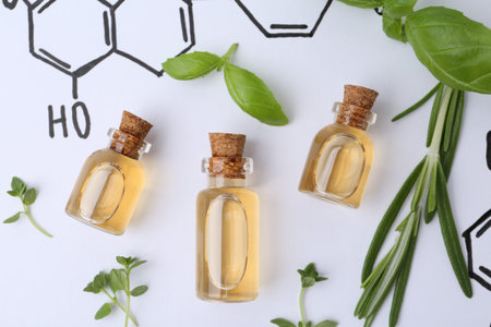 Hands in laboratory manipulating pipette with bottles filled with rosemary extract oil on white table. Top view.