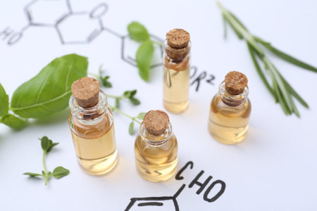 Different herbs and bottles of cosmetic products on paper with chemical formulas, closeup