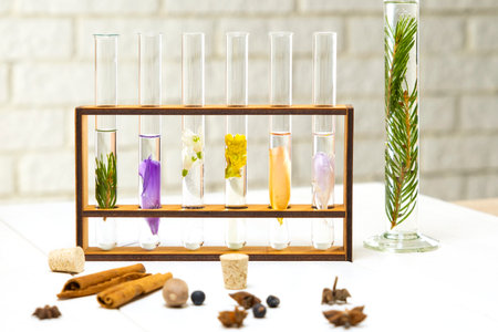 Fresh flowers in chemical test tubes on the table. Preparation of perfumes from natural ingredients, aromatherapy.