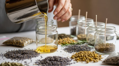 A person pouring yellow oil from a metal jug into a glass jar on a table with various seeds and herbs, including piles of black, brown, and green seeds, and several glass jars with wooden sticks