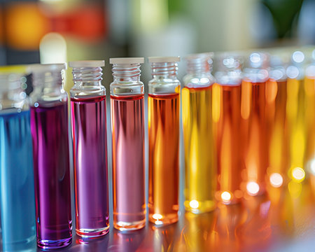 Set of brown glassware with labels of assorted chemicals in chemical lab, against light-blue toned background