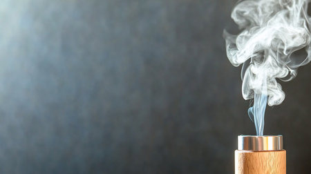 Delicate white smoke rises from a wooden container with a metallic top, creating a wispy, ethereal effect against a dark background.