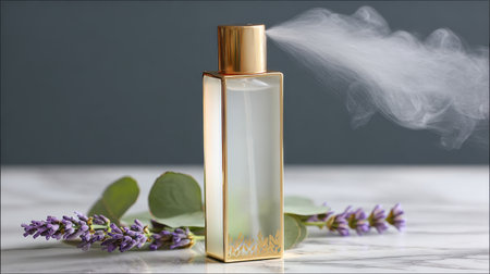 Transparent perfume bottle spraying a delicate mist, surrounded by eucalyptus and lavender on a marble surface, creating a luxurious and aromatic atmosphere. Generative ai