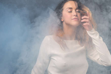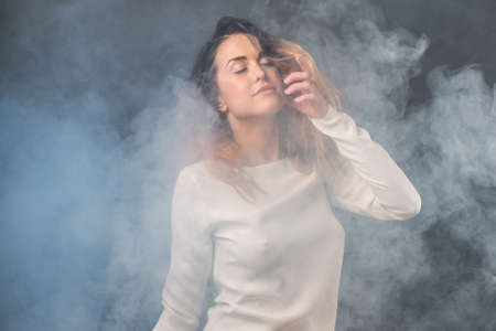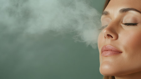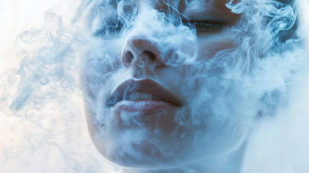 A close-up of a woman's serene face, partially obscured by swirling smoke, creating a soft and mysterious atmosphere.