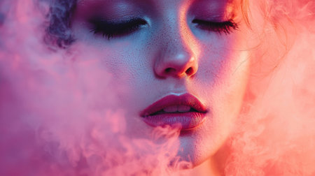 A creative and artistic portrait of a woman with her eyes closed, surrounded by a soft pink smoke, creating a dreamy and ethereal effect.