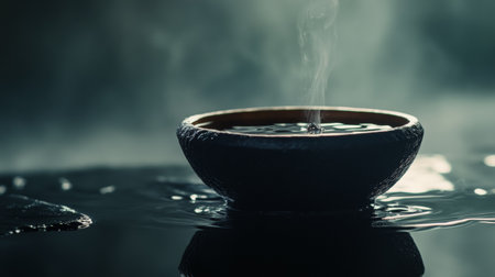A serene image of a steaming cup of tea placed on a dark textured surface, creating a moody and tranquil atmosphere.