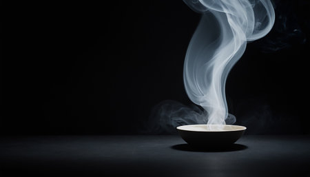 A striking abstract featuring white steam or smoke gracefully rising from a dark, shallow bowl placed on a dark surface. The vapor forms an twisting plume against the black background, creating a sense of gentle movement and ethereal beauty. The subtle illumination highlights the translucent of the steam, while the dark bowl and surface provide a grounding contrast. evokes a sense of warmth and aroma, culinary or atmospheric themes.