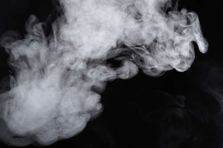 Abstract curly white steam, smoke flies out of the nozzle on a black background, copy space.