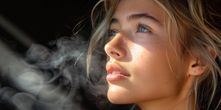 A close-up profile of a woman exhaling smoke against a dark background, with the light emphasizing the texture and movement of the smoke in a dramatic and artistic composition.