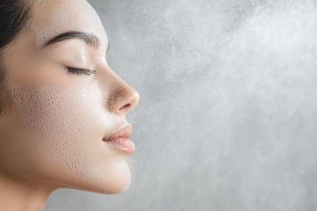Woman misting their face with a hydrating spray. Person expression is one of contentment, with slightly closed eyes enjoying the moment. Generative AI