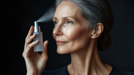 Mature woman applying a hydrating mist to her face, highlighting the importance of moisture in an anti-aging skin care routine.