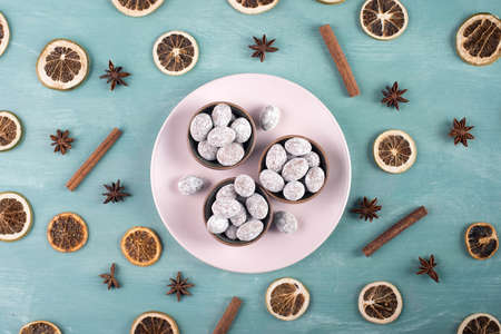 Spiced almonds with chocolate powder, traditional german christmas sweets with spices like cinnamon, anise, winter season