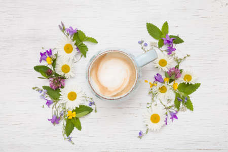 Top view on beautiful wild flowers in shape of wreath and a cup of cappuccino coffee on white wooden background. Summer flowers, leaves, petals and coffee on the table. Flat lay