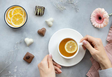 womans hands holding a cup of hot tea with lemon and various sweets on a gray background with flowers. Womens Day, Valentines Day. horizontal image, top view, flat lay