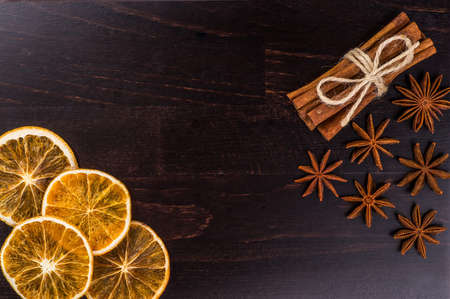 border of spice on white background. Ingredients for a mulled wine. Cinnamon, anise stars, orange, brown sugar, cloves. Christmas hot drink
