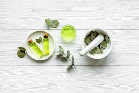 Herbal medicine natural cosmetics. Eucalyptus leaves in white mortar, top view