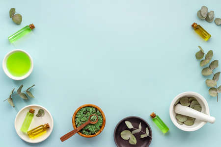 Herbal cosmetic product. Eucalyptus essential oil, top view