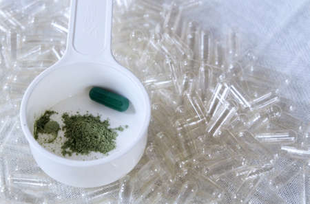 Medical Concept, Unpack Herbal Powder with Green Capsule in A Measuring Spoon.