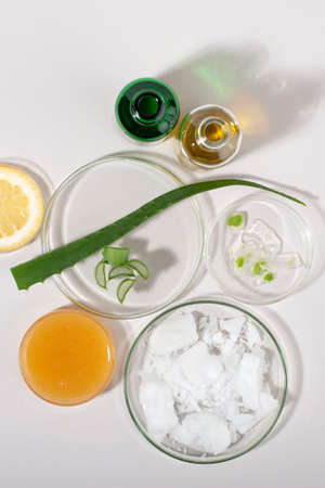Abstract cosmetic laboratory. Aloe vera cosmetic product, natural ingredients and laboratory glassware.