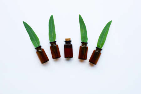 Eucalyptus oil bottle with leaves on white background. top view