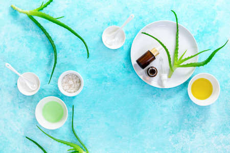 Aloe Vera skin facial mask ingredients. DIY homemade natural skin care products. Eco friendly cosmetics. Flat lay, top view.