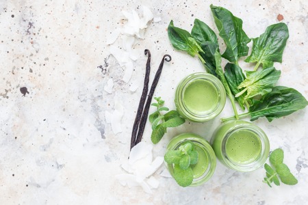 Vanilla, mint, spinach and coconut milk detox green smoothie in glass, horizontal, top view, copy space