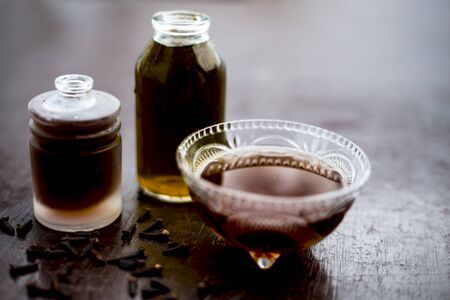 Face mask of clove oil on wooden surface consisting of clove oil and olive oil for the treatment of cleaning dirt and black heads from the skin.