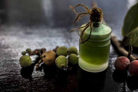 Close up shot of essential banyan tree oil in a transparent glass bottle along with some banyan fruit and its leaf on a black glossy wooden surface. Horizontal shot.
