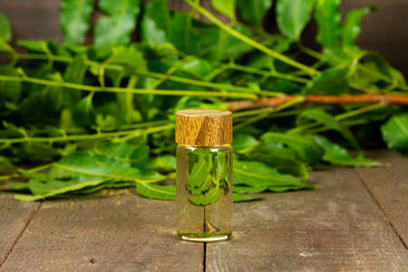 neem oil in bottle and neem leaf on wooden background.